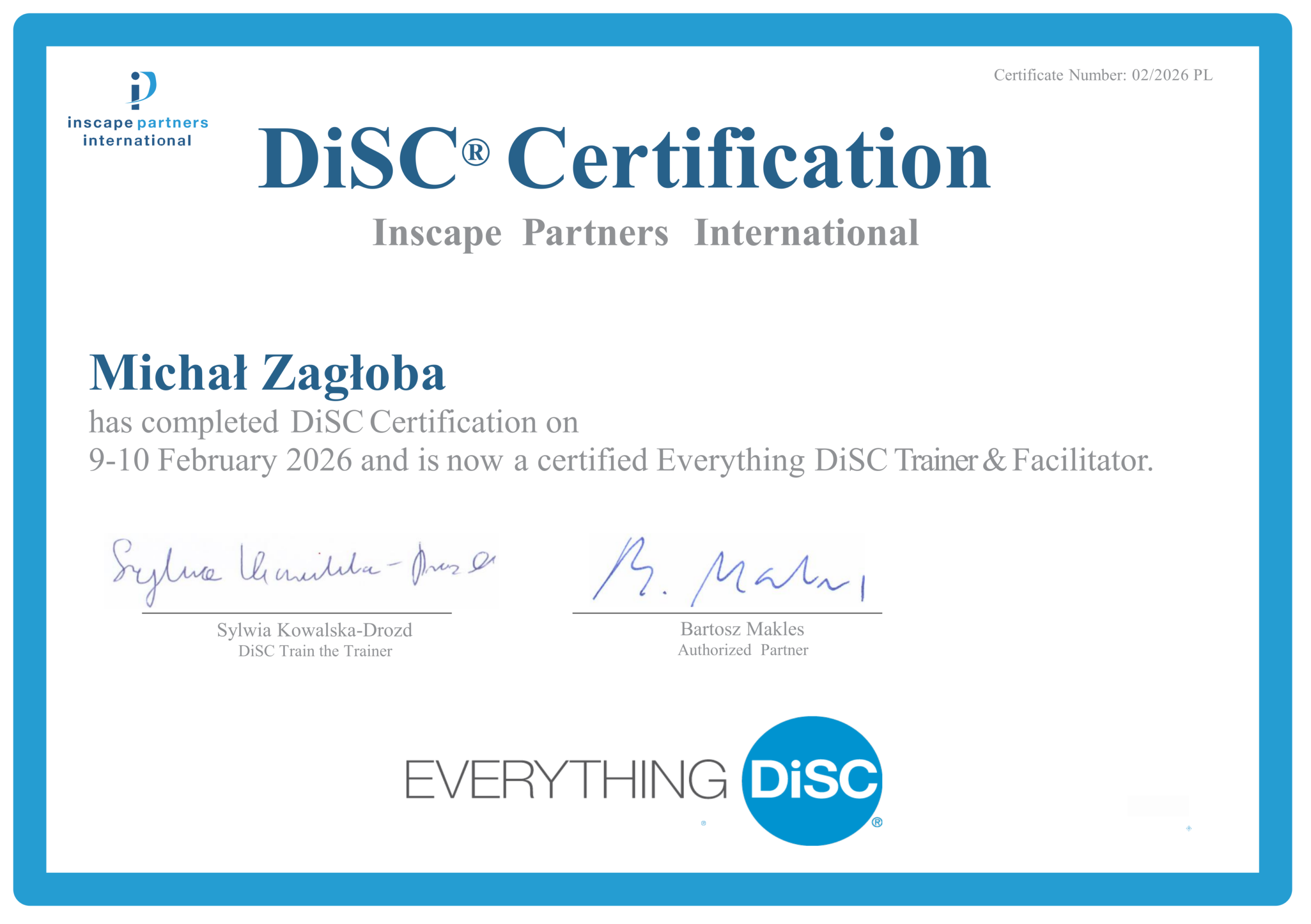Nazywam się Michał Zagłoba — jestem prawnikiem, dyplomowanym trenerem biznesu, coachem i szkoleniowcem. Od 2007 roku związałem się z branżą medialną i komunikacją w jej najbardziej wymagającej, realnej wersji: tam, gdzie liczy się każda decyzja, każde słowo i każda minuta. Ukończyłem Wydział Prawa Uniwersytetu w Białymstoku, jestem majorem Służby Więziennej w stanie spoczynku, certyfikowanym trenerem DISC i prowadzę firmę szkoleniowo-doradczą Michał Zagłoba Consulting.